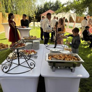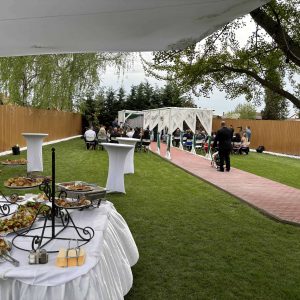 - Kertben fogadás ételekkel és italokkal + 2000 Ft/fő.